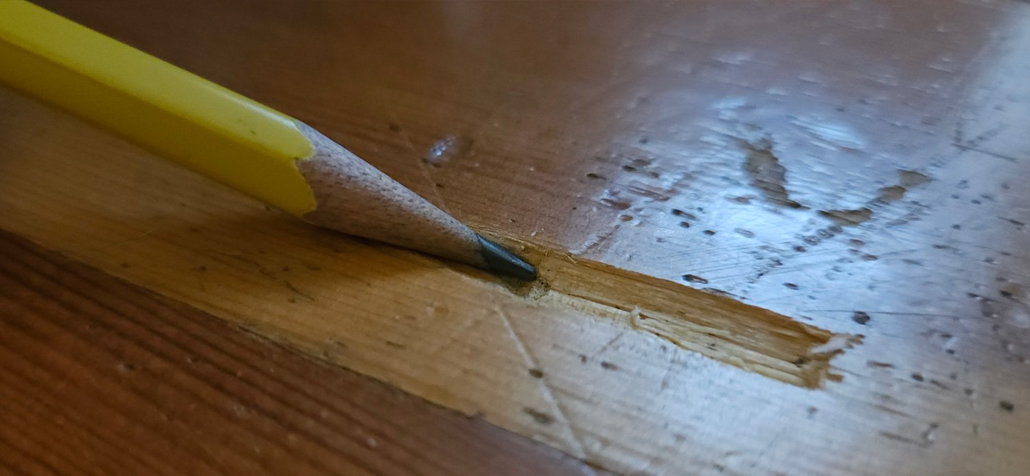 A deep gouge on a Douglas-fir floor from the 1920s.