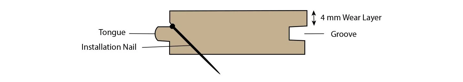 Below the wear layer is what is referred to as the tongue and groove. Older floors were constructed of solid wood. The tongue and groove allowed this flooring to interlock together as it was installed, while also providing a way to hide the installation nails that secured it to the sub flooring. All the wood below the top of that installation nail forms the bottom layer which was never meant to act as the surface of your floor.