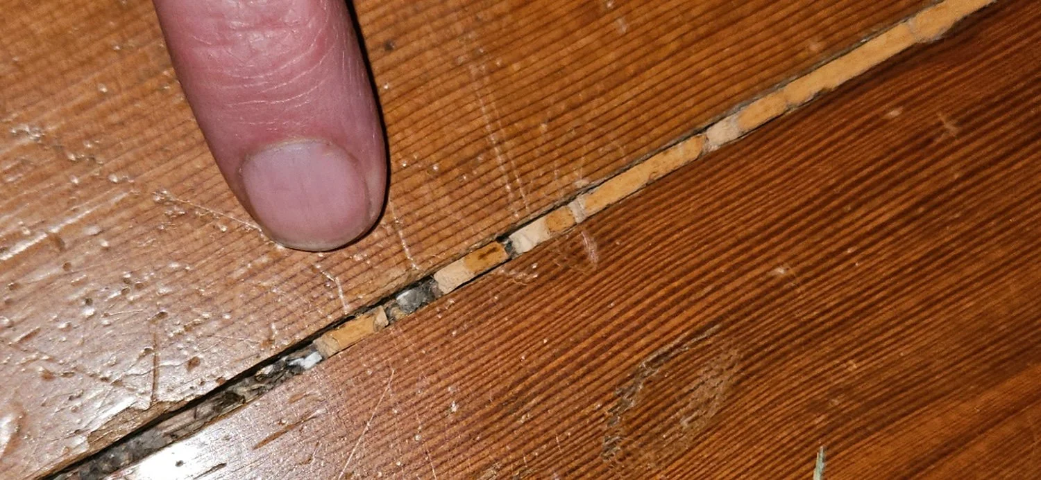 Over time and continuing expansion and contraction, the filler that was used for the gaps between these Douglas-fir floor planks has deteriorated.